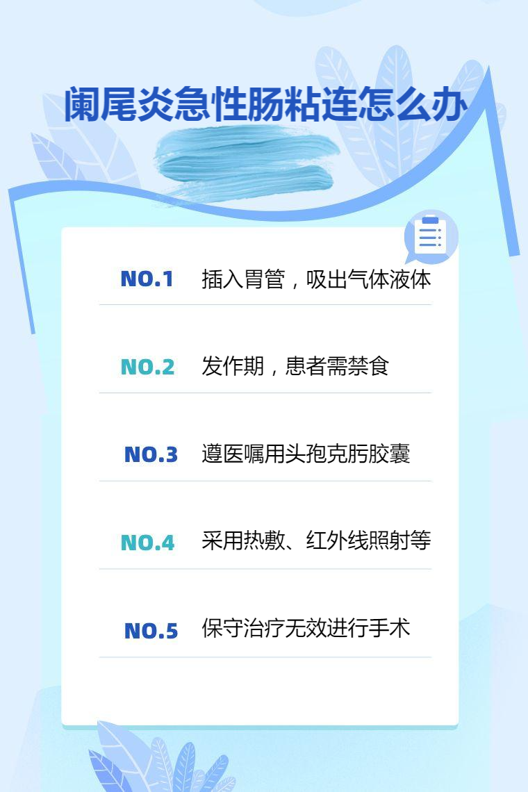 闌尾炎急性腸粘連可通過胃腸減壓、禁食補液、藥物治療、物理治療、手術治療等方法處理。