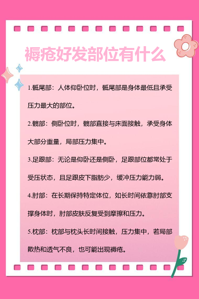 褥瘡好發部位有骶尾部、髖部、足跟部、肘部、枕部等。
