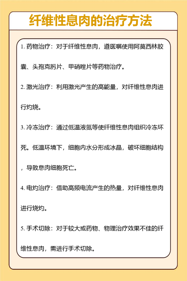 纖維性息肉的治療方法主要有藥物治療、激光治療、冷凍治療、電灼治療、手術切除等。