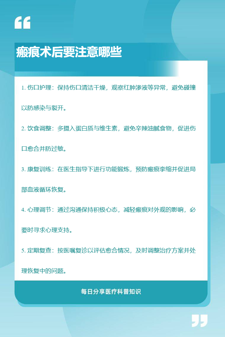 瘢痕術後要注意傷口護理、飲食調整、康復訓練、心理調節、定期復查等。