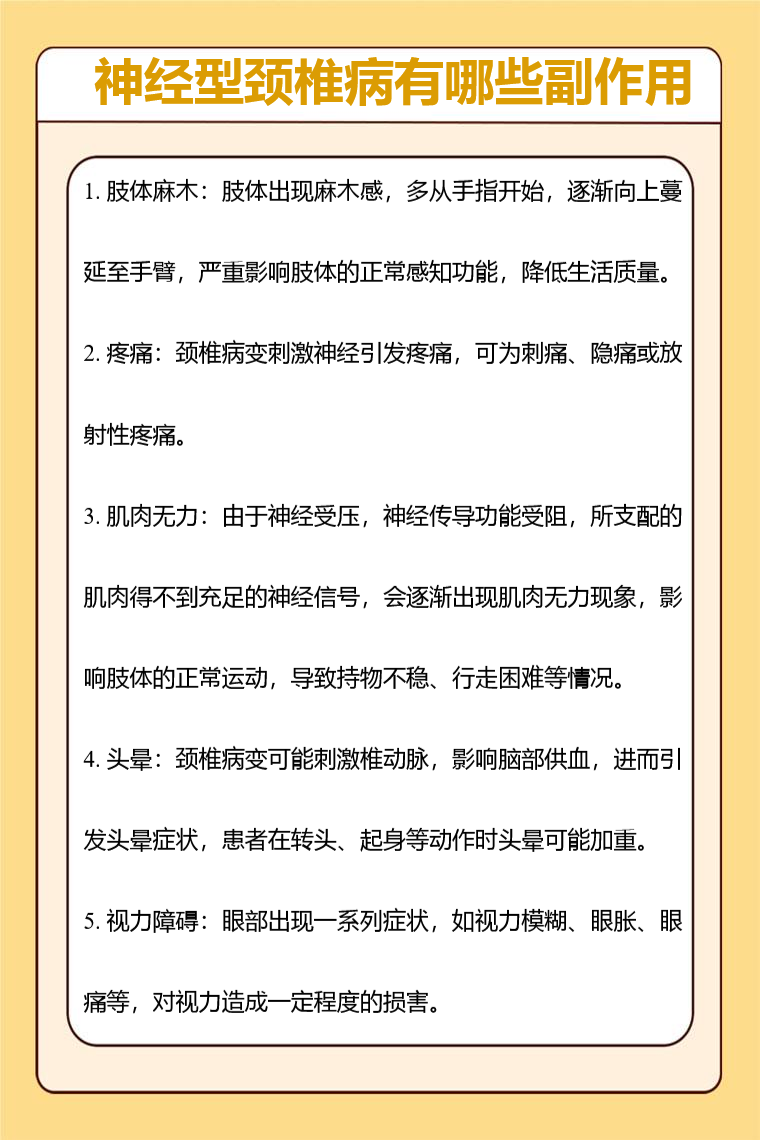 神經型頸椎病的副作用有肢體麻木、疼痛、肌肉無力、頭暈、視力障礙等。