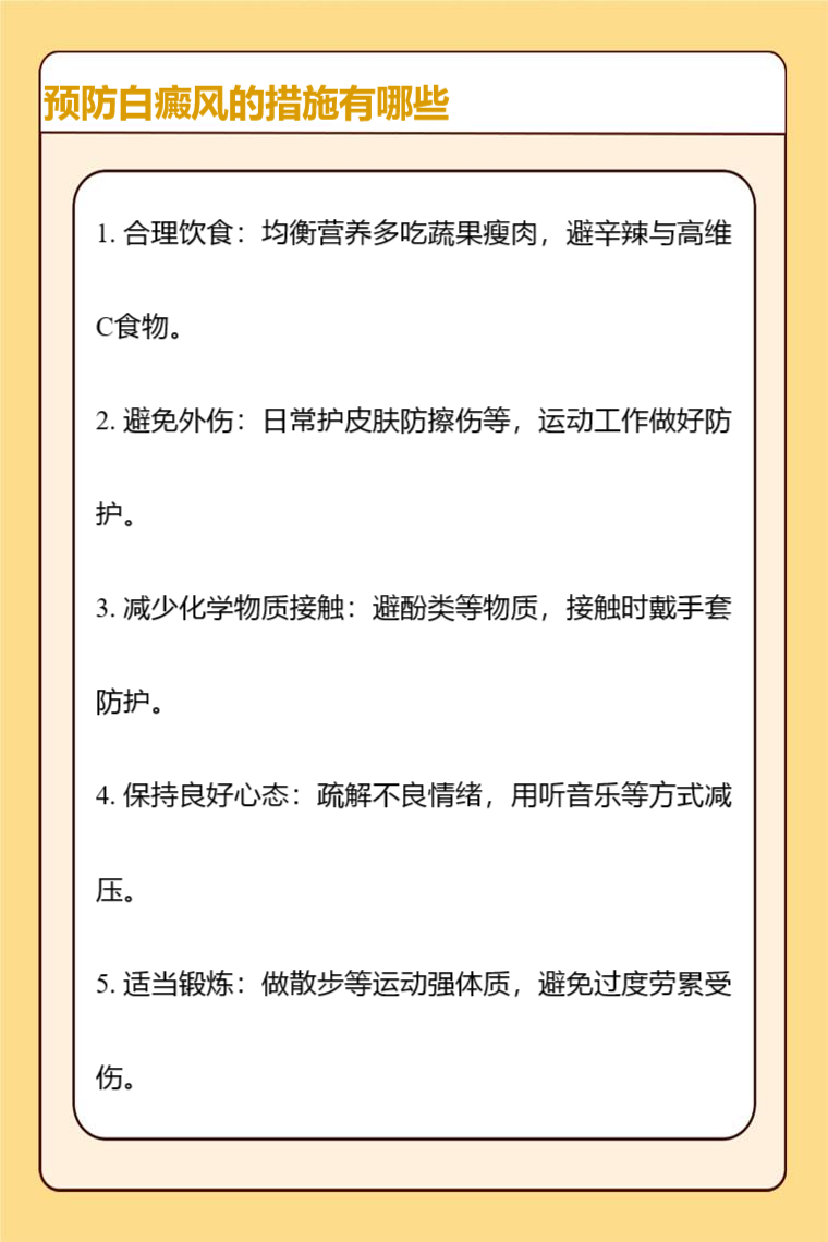 預防白癜風的措施有合理飲食、避免外傷、減少化學物質接觸、保持良好心態、適當鍛鍊等。