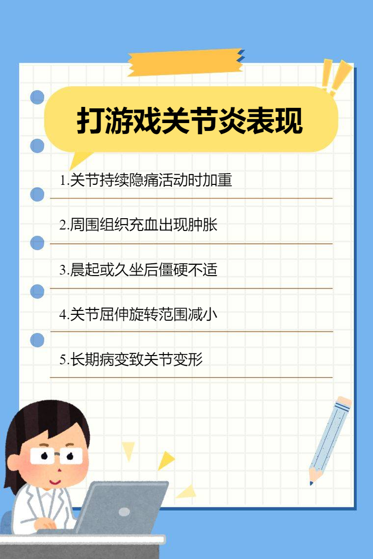 打遊戲關節炎的表現有關節疼痛、腫脹、僵硬、活動受限、畸形等。
