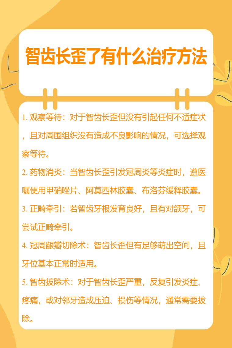 智齒長歪了常見的治療方法有觀察等待、藥物消炎、正畸牽引、冠周齦瓣切除術、智齒拔除術等。
