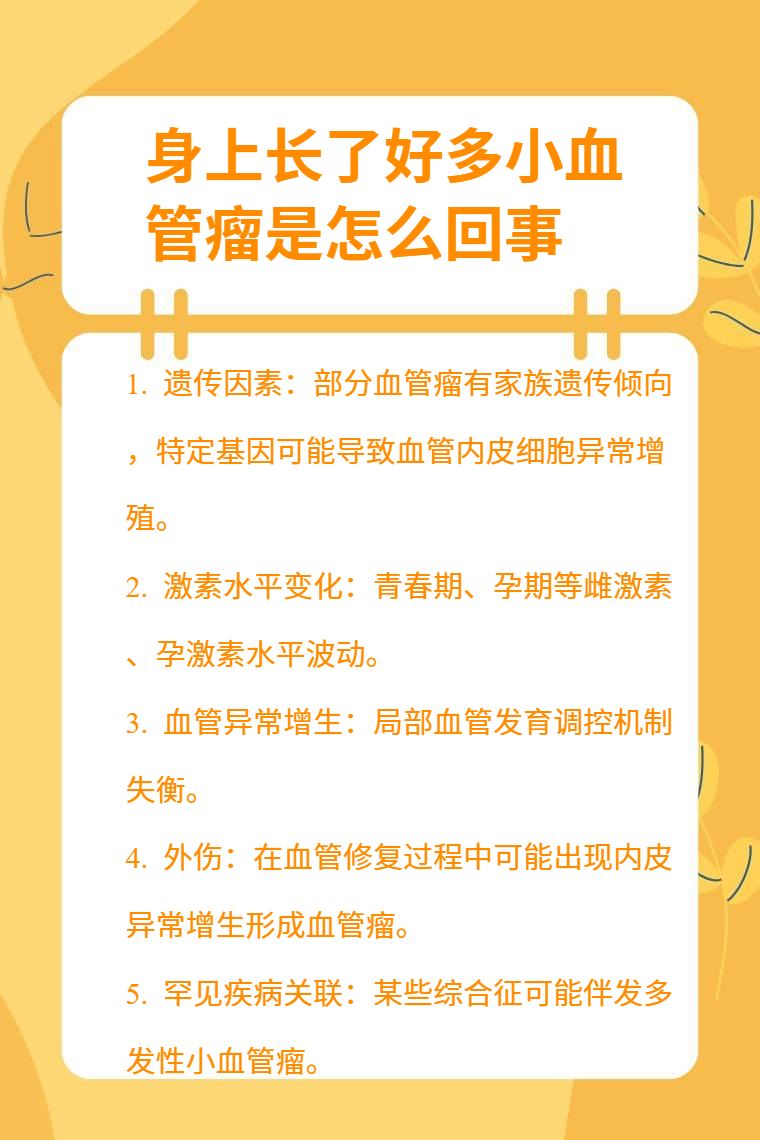 身上長了好多小血管瘤可能與遺傳因素、激素水平變化、血管異常增生、外傷、某些罕見疾病等有關。