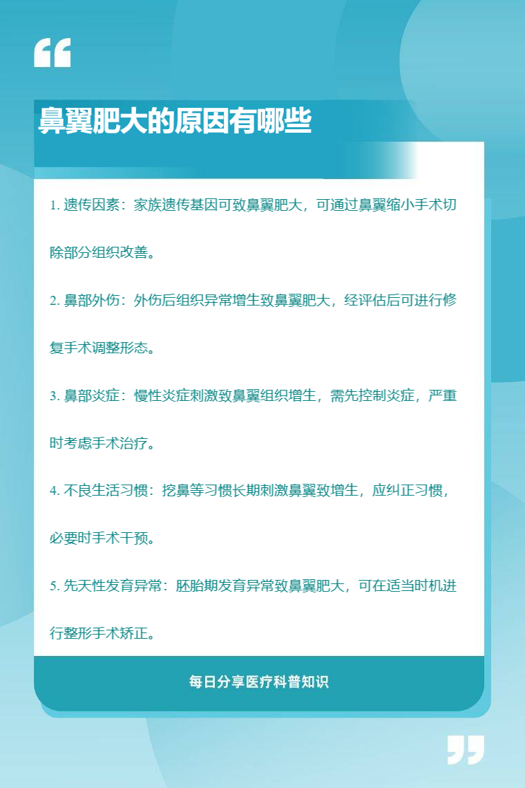 鼻翼肥大常見原因有遺傳因素、鼻部外傷、鼻部炎症、不良生活習慣、先天性發育異常等。