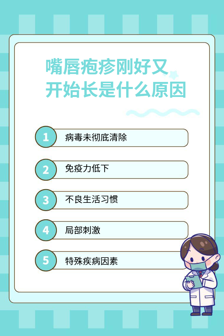 嘴唇皰疹剛好又開始長的原因有病毒未徹底清除、免疫力低下、不良生活習慣、局部刺激、特殊疾病因素等。