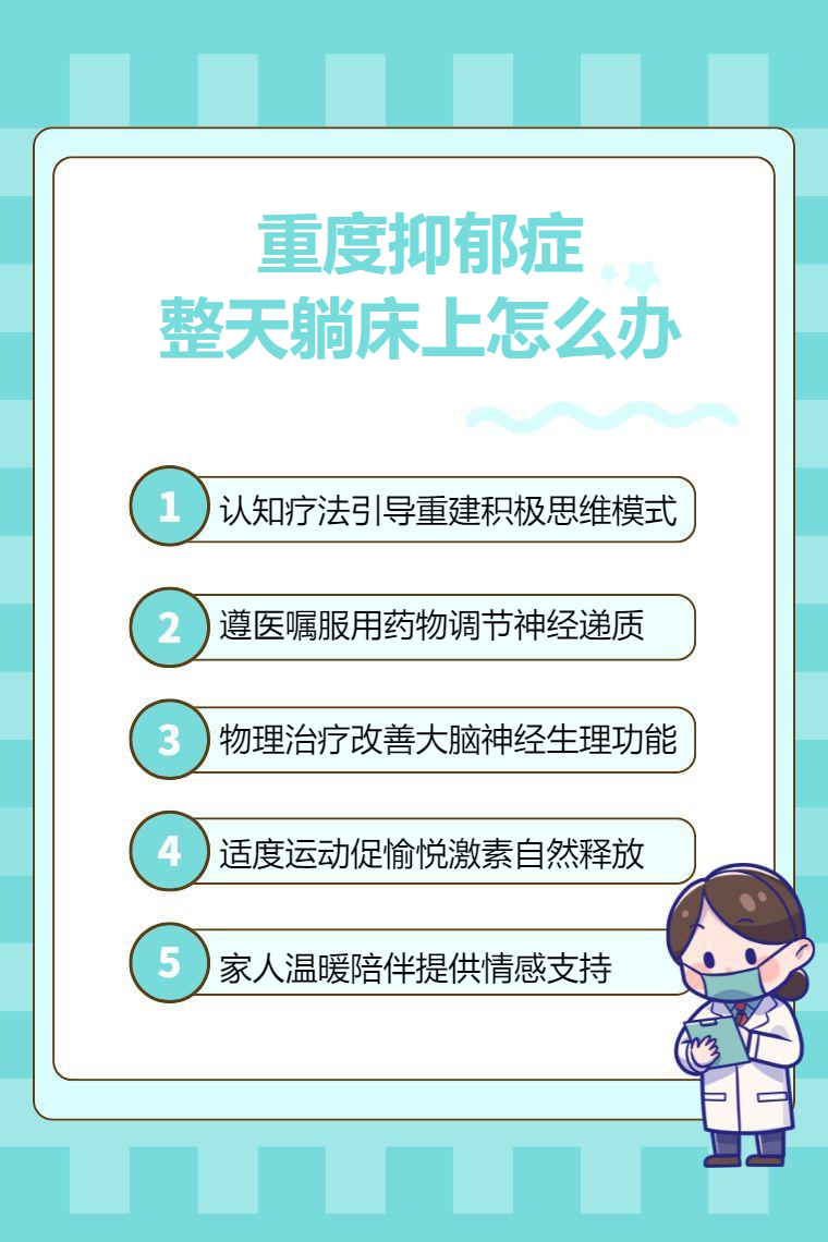 對於重度抑鬱症整天躺床上的情況,可通過心理治療、藥物治療、物理治療、運動療法、家人支持等方法來改善。