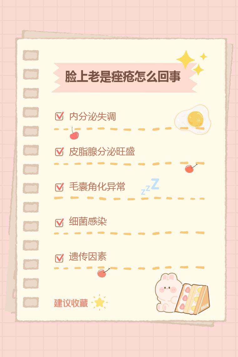 臉上老是長痤瘡,常見原因有內分泌失調、皮脂腺分泌旺盛、毛囊角化異常、細菌感染、遺傳因素等。
