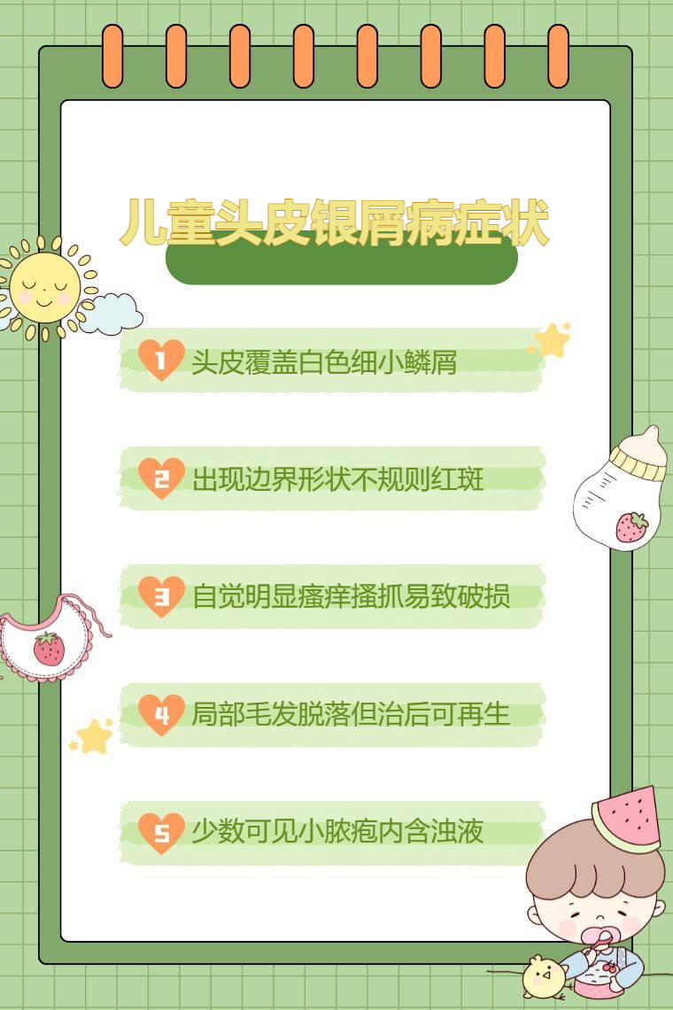 兒童頭皮銀屑病症狀包括鱗屑、紅斑、瘙癢、脫發、膿皰等。