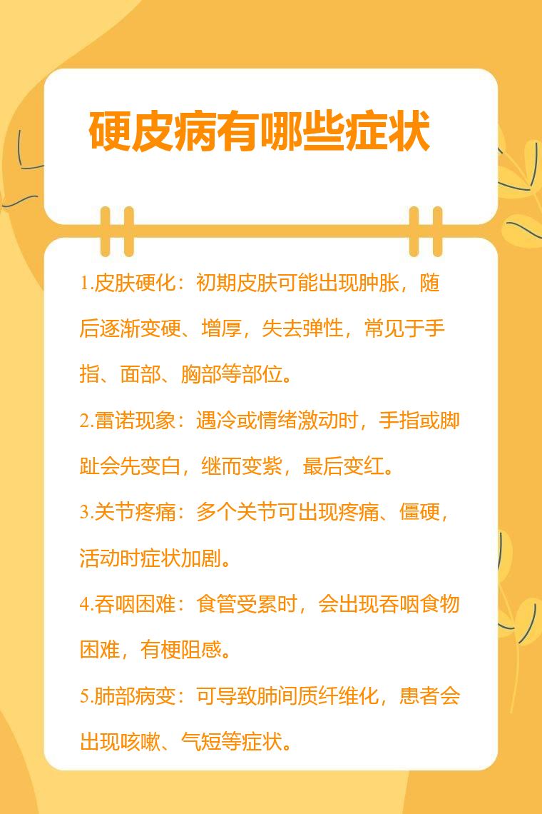 1.皮膚硬化:初期皮膚可能出現腫脹,隨後逐漸變硬、增厚,失去彈性,常見於手指、面部、胸部等部位,嚴重時皮膚會像皮革一樣緊繃,影響正常活動。