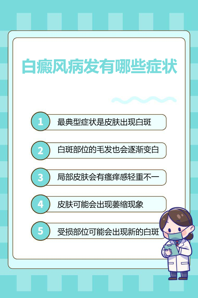 1. 皮膚白斑:白癜風最典型症狀是皮膚出現白斑,初期多為指甲至錢幣大小,近似圓形、橢圓形或不規則形,邊界多清晰,顏色多呈淺白色,隨著病情發展,白斑面積會逐漸擴大,數目增多,顏色也可變為瓷白色。