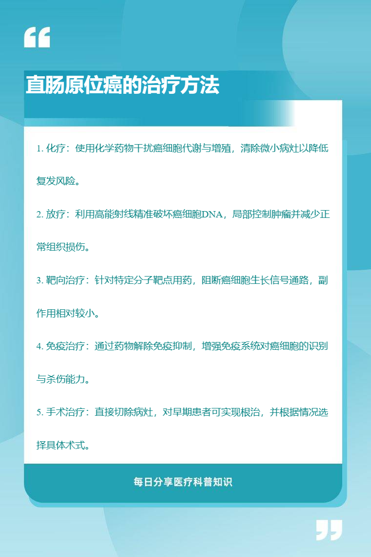 直腸原位癌的治療方法主要有化療、放療、靶向治療、免疫治療、手術治療等。