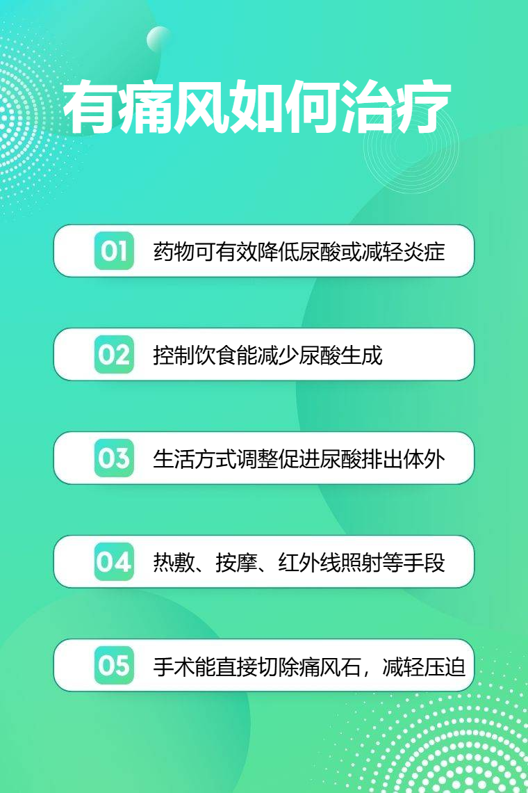 痛風的治療方法主要有藥物治療、飲食控制、生活方式調整、物理治療、手術治療等。