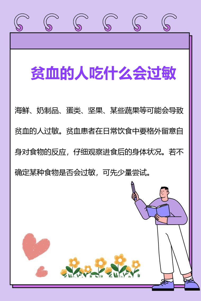 海鮮、奶製品、蛋類、堅果、某些蔬果等可能會導致貧血的人過敏。