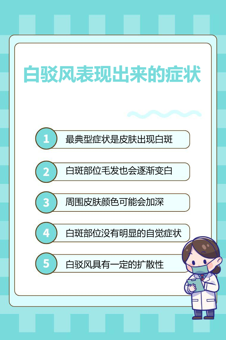 白駁風表現出來的症狀有皮膚白斑、毛髮變白、邊界清晰、無自覺症狀、白斑擴散等。