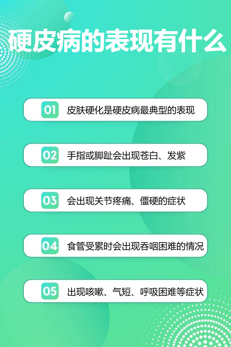 硬皮病的表現有皮膚硬化、雷諾現象、關節疼痛、吞咽困難、肺部病變等。