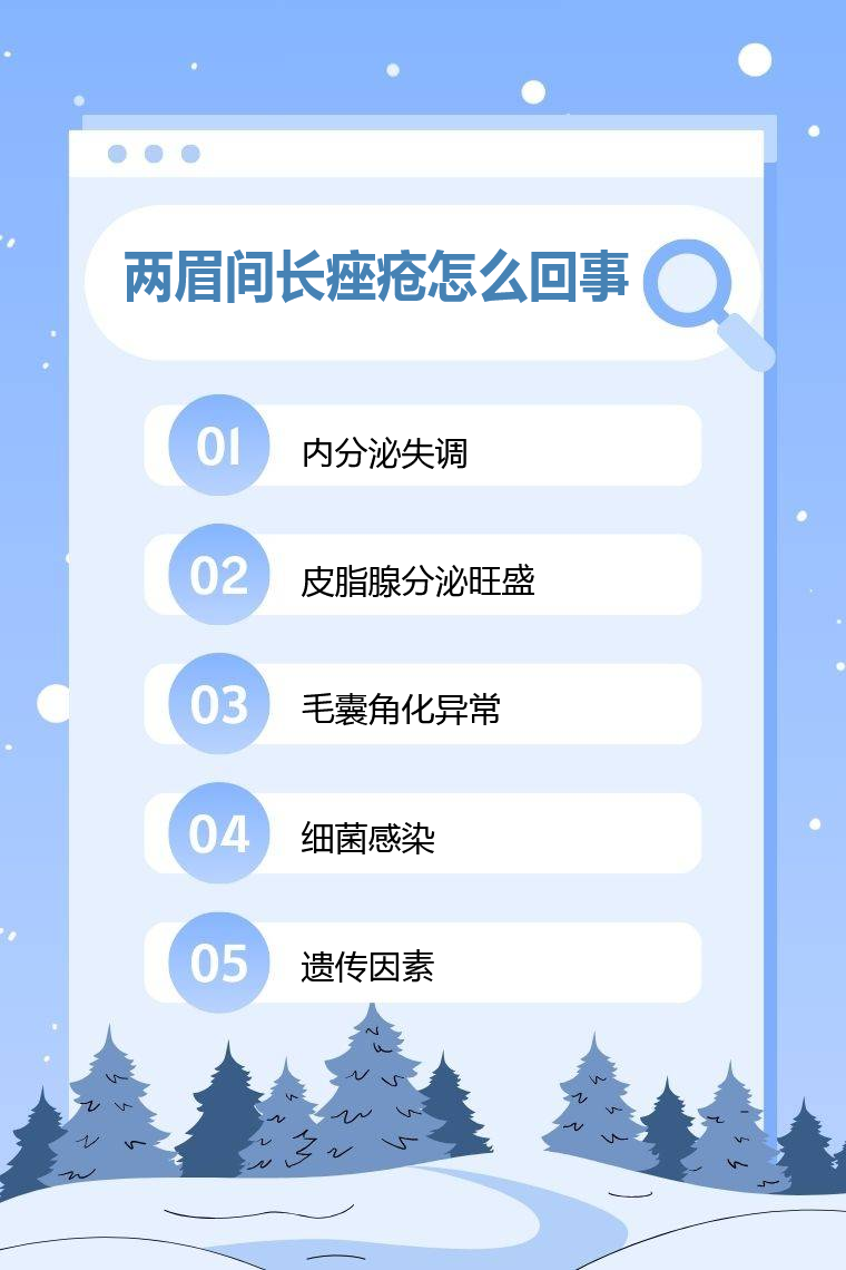 兩眉間長痤瘡常見原因有內分泌失調、皮脂腺分泌旺盛、毛囊角化異常、細菌感染、遺傳因素等。