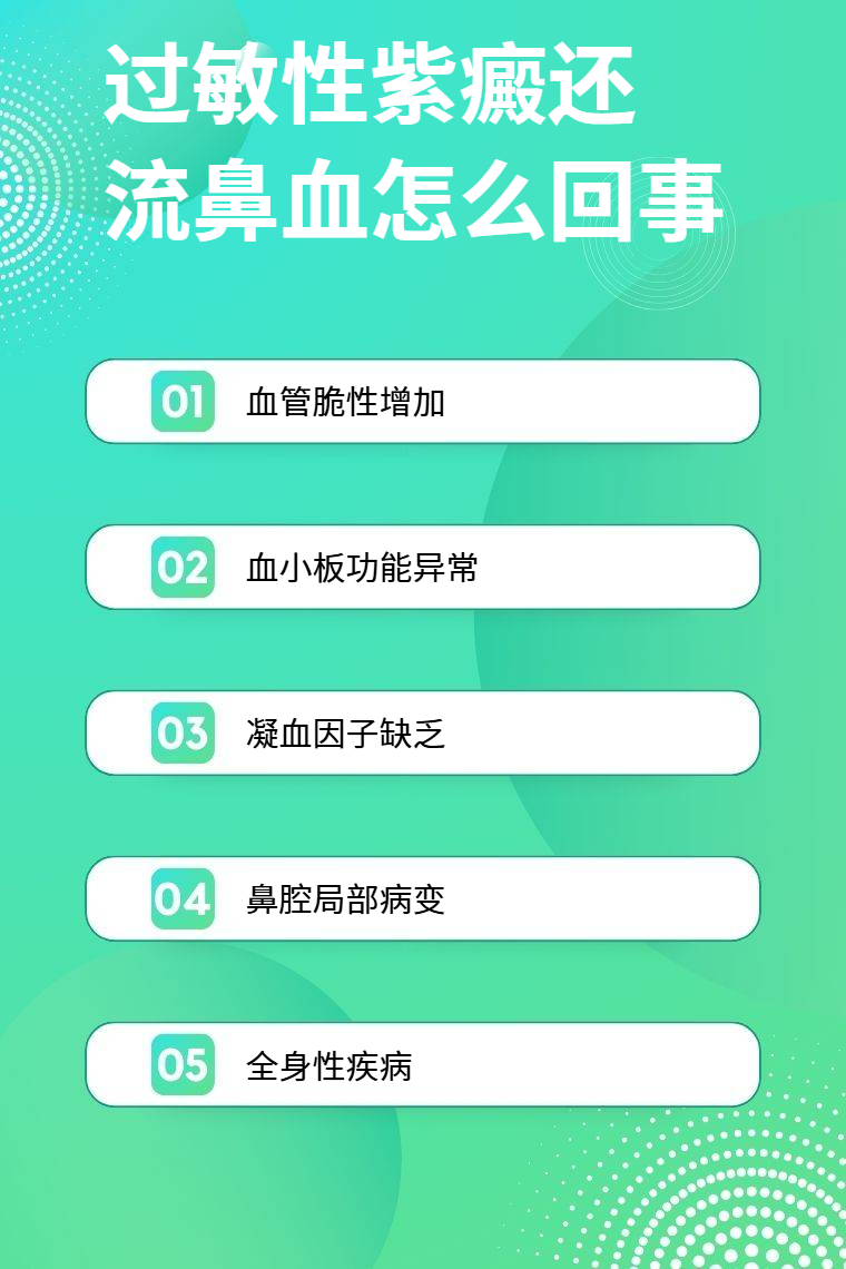 過敏性紫癜還流鼻血可能是由於血管脆性增加、血小板功能異常、凝血因子缺乏、鼻腔局部病變、全身性疾病等。