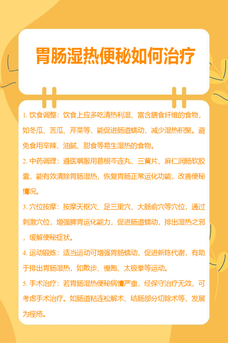 胃腸濕熱便秘可通過飲食調整、中藥調理、穴位按摩、運動鍛鍊、手術治療等方法來應對。