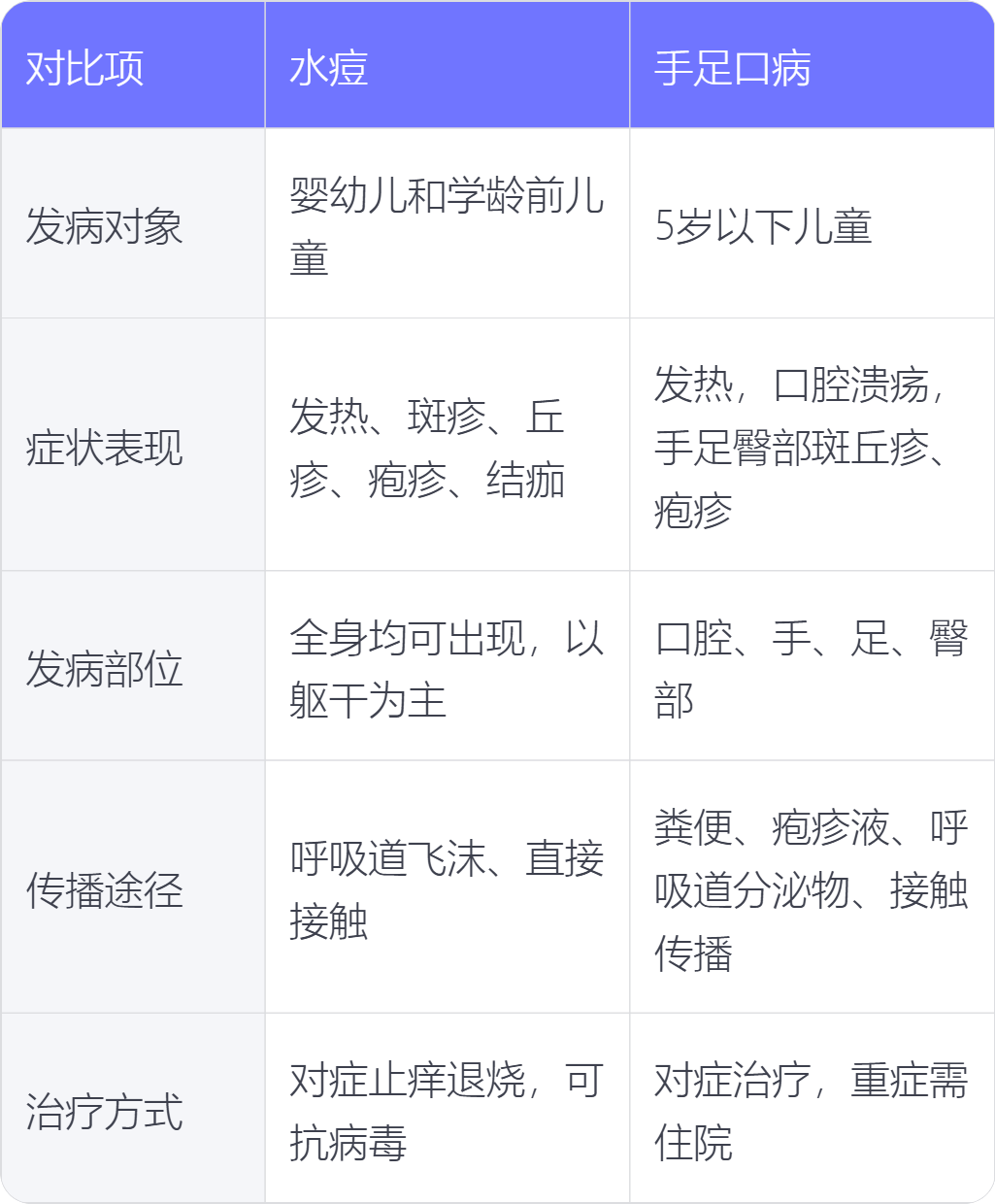 5. 治療方式:水痘一般以對症治療為主,如止癢、退燒等,可使用抗病毒藥物;手足口病也多為對症治療,若病情嚴重可能需住院治療。