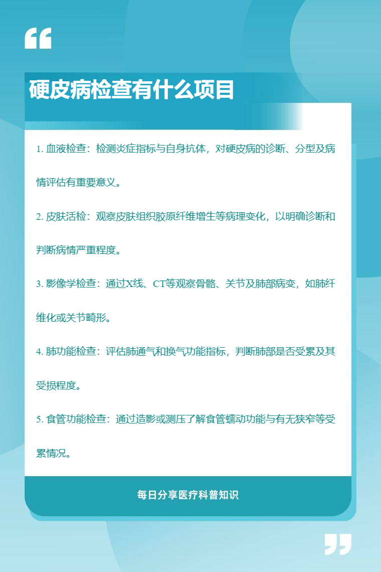 硬皮病檢查項目有血液檢查、皮膚活檢、影像學檢查、肺功能檢查、食管功能檢查等。