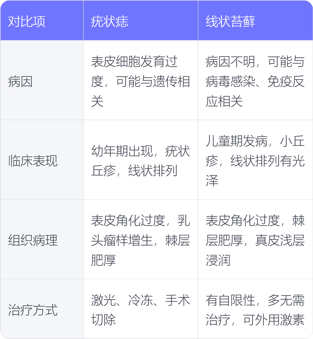 疣狀痣和線狀苔蘚在病因、臨床表現、組織病理、治療方式上存在不同。