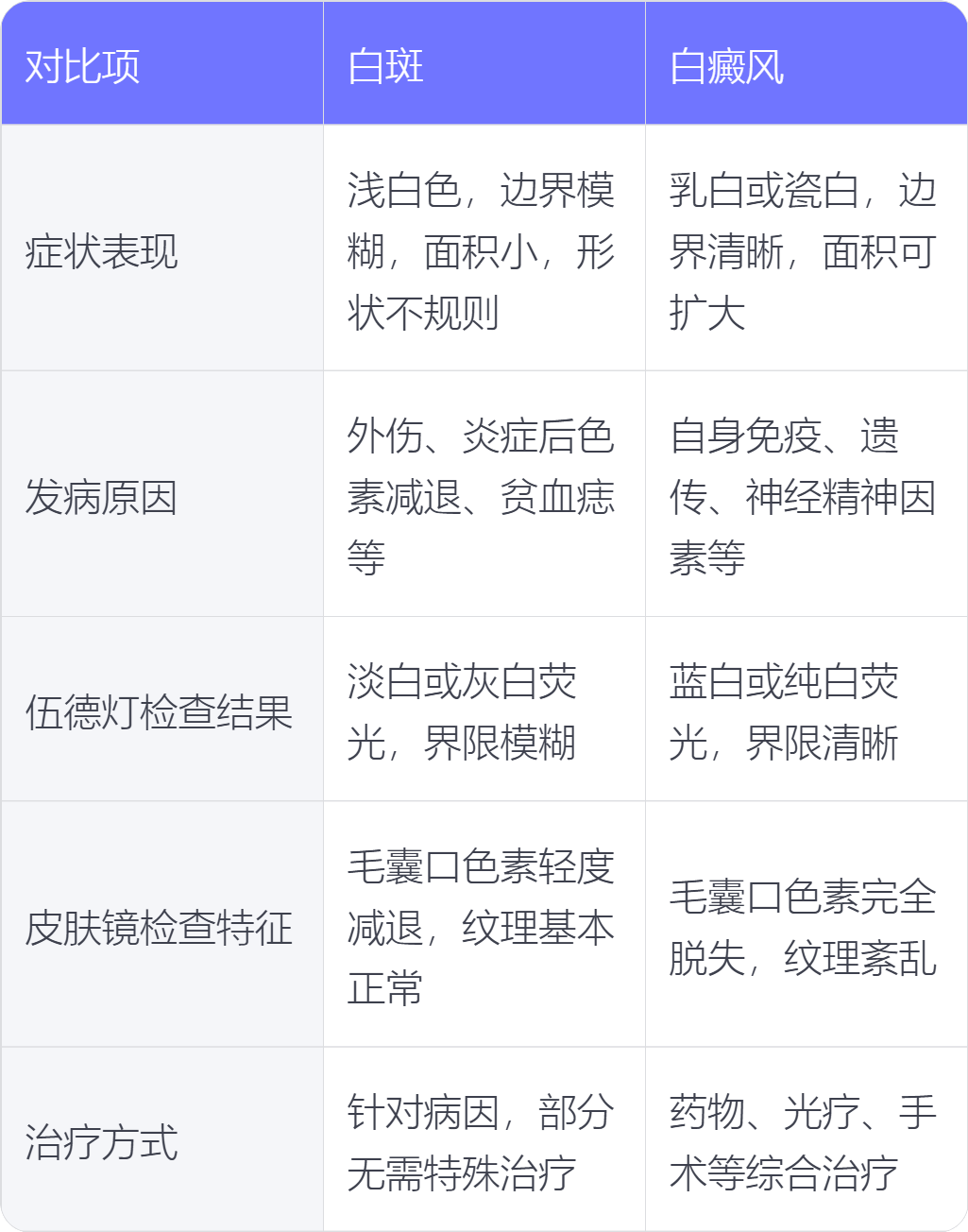 白斑與白癜風可從症狀表現、發病原因、伍德燈檢查結果、皮膚鏡檢查特徵、治療方式來區分。