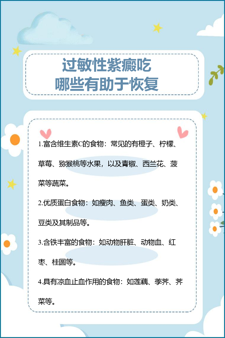 過敏性紫癜患者食用富含維生素C的食物、優質蛋白食物、含鐵豐富的食物、具有涼血止血作用的食物等有助於恢復。