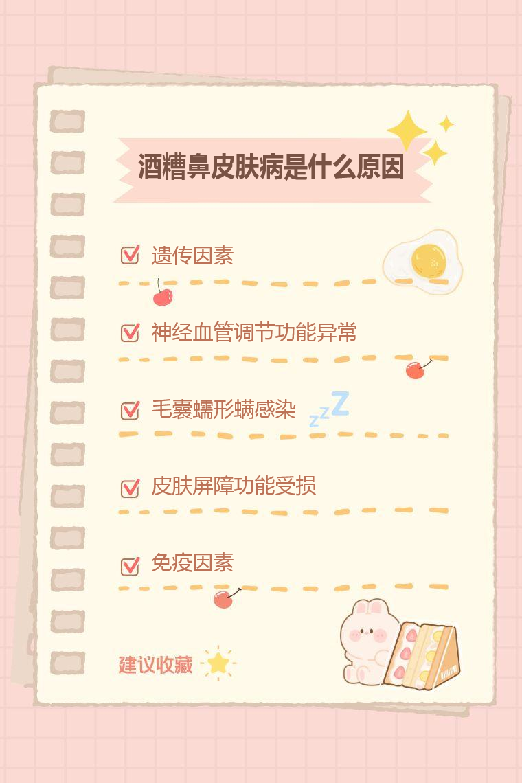 酒糟鼻皮膚病的原因有遺傳因素、神經血管調節功能異常、毛囊蠕形蟎感染、皮膚屏障功能受損、免疫因素等。