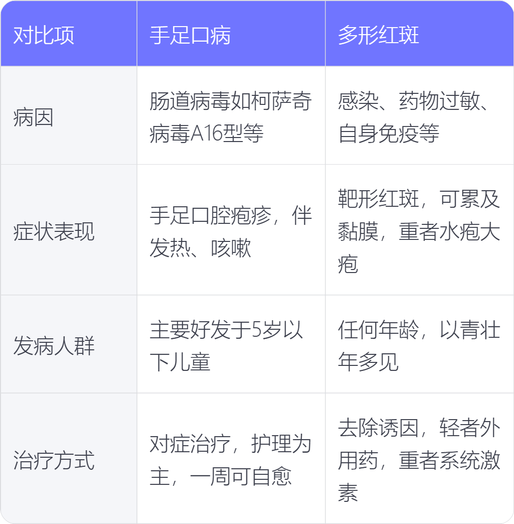 手足口病和多形紅斑在病因、症狀表現、發病人群、治療方式上存在不同。