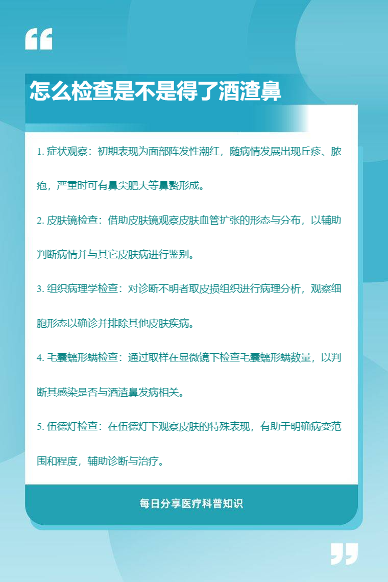 檢查是否得了酒渣鼻可通過症狀觀察、皮膚鏡檢查、組織病理學檢查、毛囊蠕形蟎檢查、伍德燈檢查等。