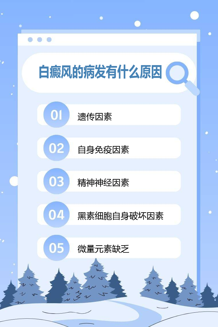 白癜風的病發原因有遺傳因素、自身免疫因素、精神神經因素、黑素細胞自身破壞因素、微量元素缺乏等。