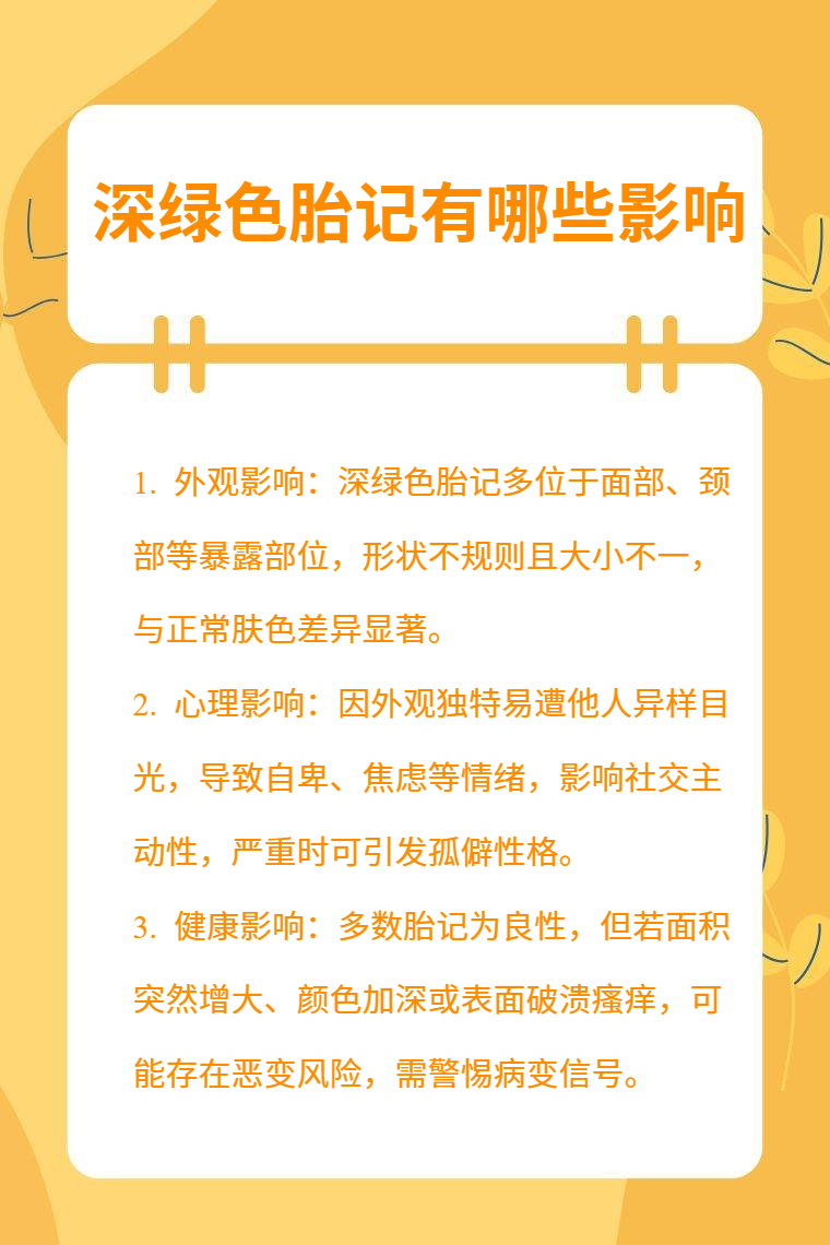 深綠色胎記可能在外觀、心理、健康等方面產生影響。
