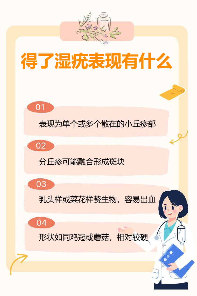 濕疣表現有丘疹、斑塊、乳頭樣或菜花樣贅生物、雞冠樣或蕈樣贅生物等。