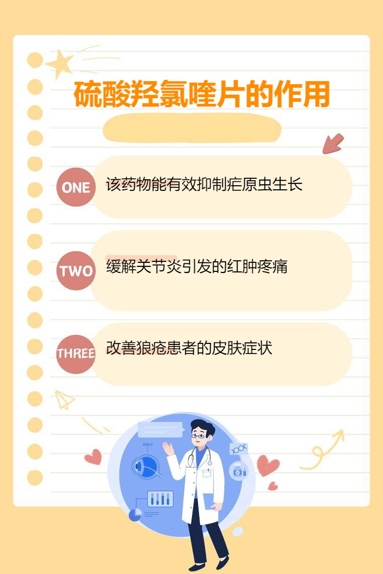硫酸羥氯喹片具有抗瘧疾、治療類風濕關節炎、治療系統性紅斑狼瘡等作用。