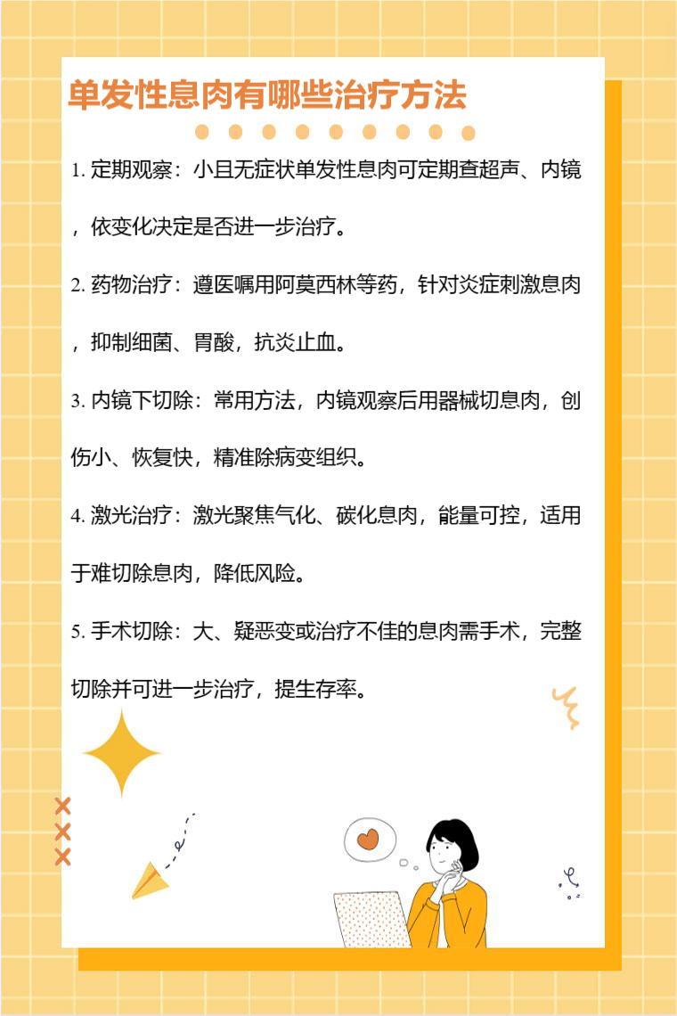 單發性息肉的治療方法有定期觀察、藥物治療、內鏡下切除、手術切除、激光治療等。