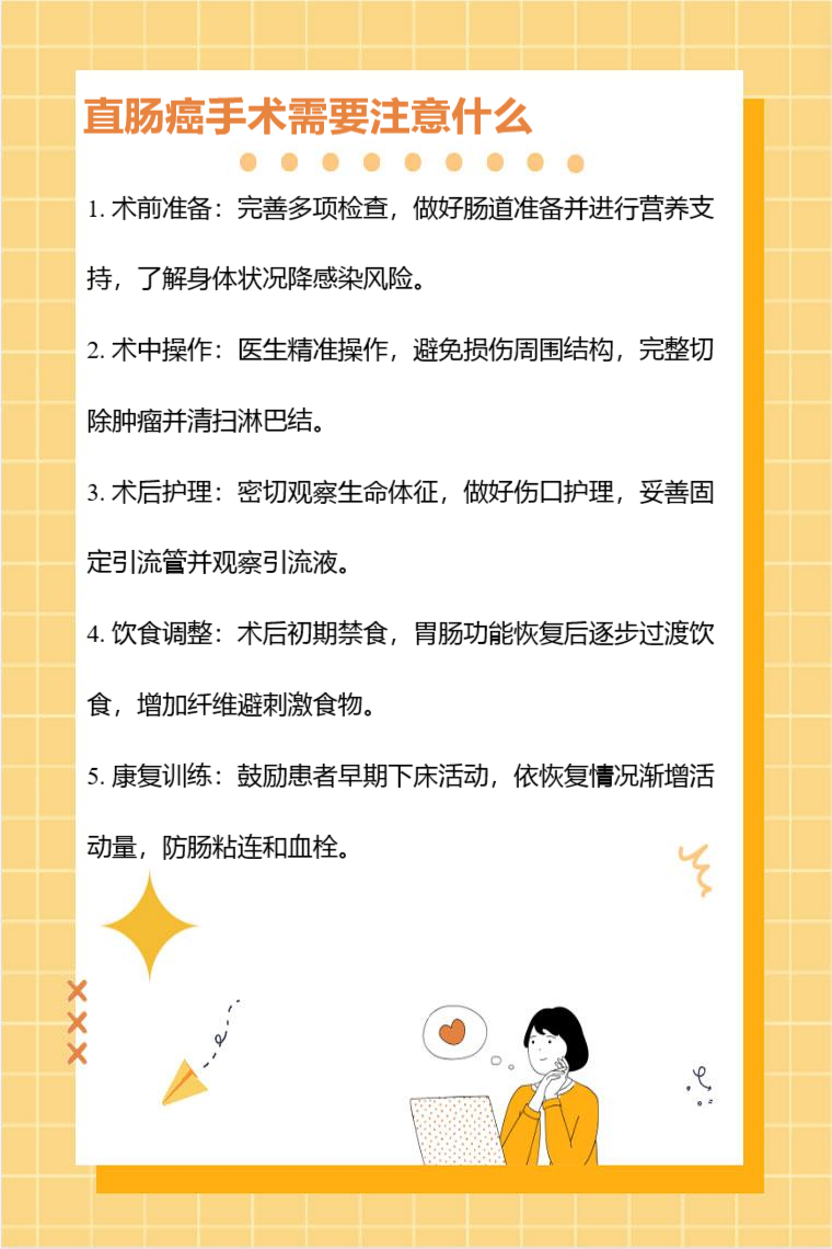 直腸癌手術需要注意術前準備、術中操作、術後護理、飲食調整、康復訓練等。