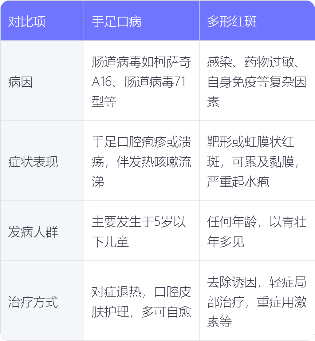 手足口病和多形紅斑在病因、症狀表現、發病人群、治療方式上存在不同。