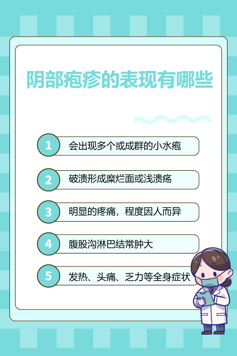 陰部皰疹的表現有簇集或散在的小水皰、破潰形成糜爛或潰瘍、自覺疼痛、腹股溝淋巴結常腫大、發熱等全身症狀等。