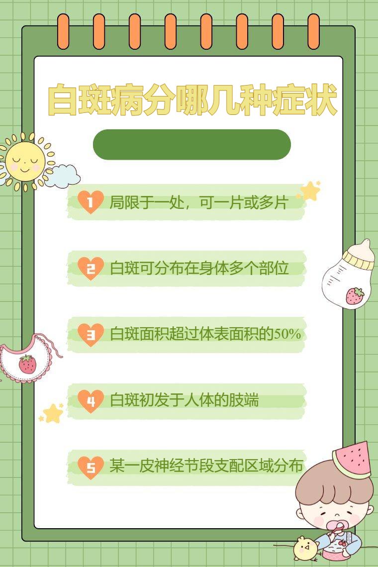 白斑病症狀主要有局限型、散髮型、泛髮型、肢端型、節段型等。