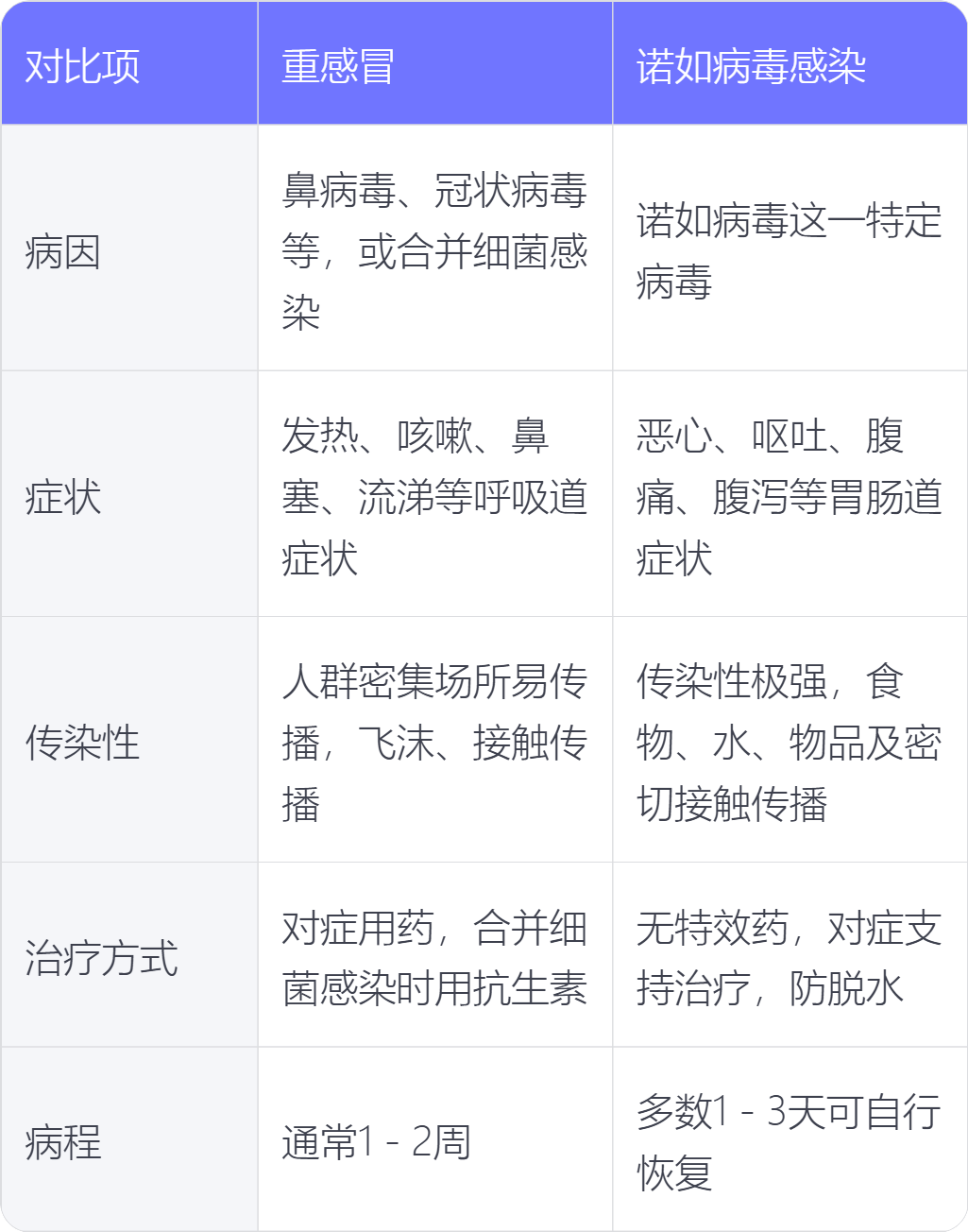 重感冒和諾如病毒感染在病因、症狀、傳染性、治療方式、病程方面存在不同。