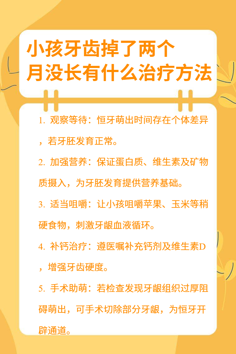 小孩牙齒掉了兩個月沒長可通過觀察等待、加強營養、適當咀嚼、補鈣治療、手術助萌等方法來應對。