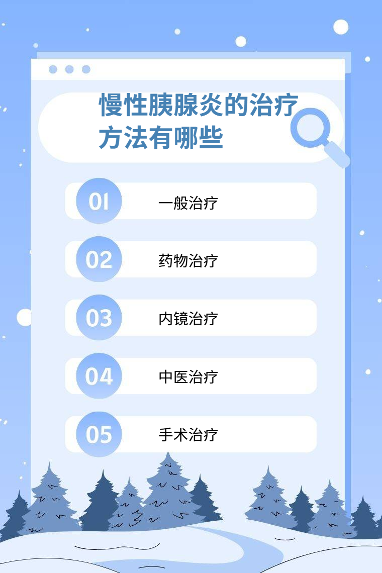 慢性胰腺炎的治療方法有一般治療、藥物治療、內鏡治療、中醫治療、手術治療等。