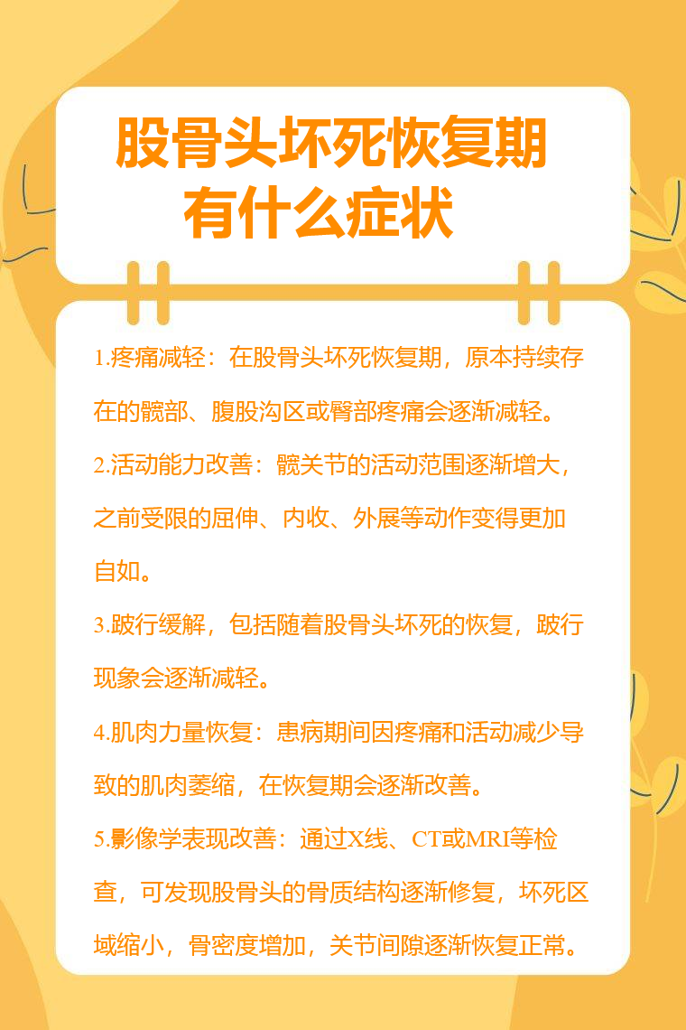 股骨頭壞死恢復期症狀包括疼痛減輕、活動能力改善、跛行緩解、肌肉力量恢復、影像學表現改善等。