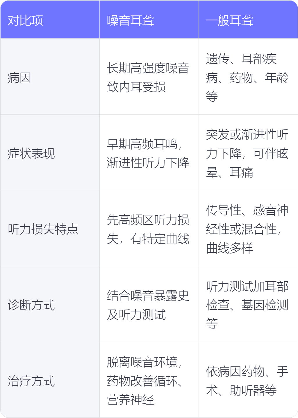 噪音耳聾與一般耳聾在病因、症狀表現、聽力損失特點、診斷方式、治療方式上存在不同。