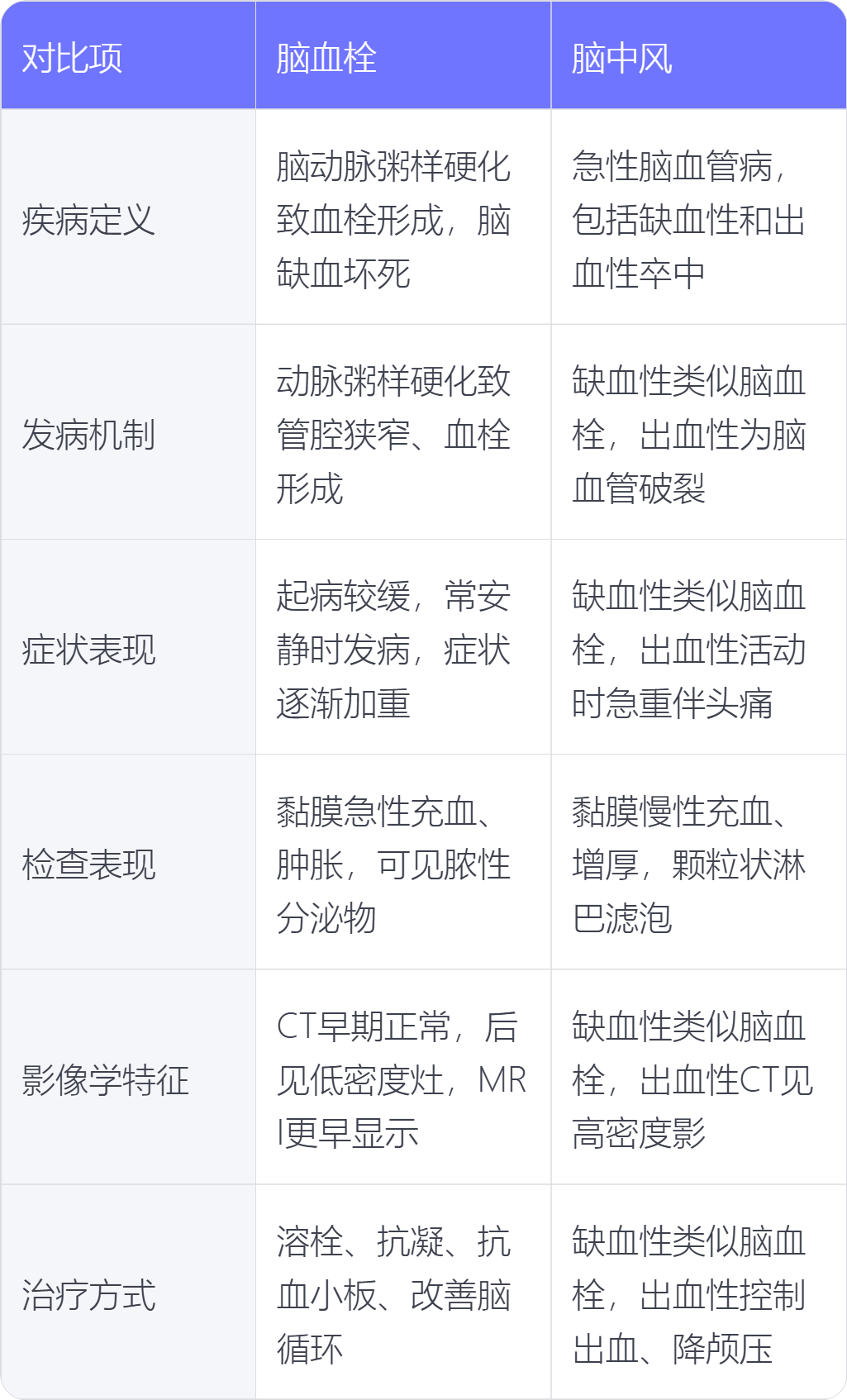 4. 影像學特徵:腦血栓在頭顱CT早期可能正常,24 - 48小時後出現低密度灶,MRI能更早發現病灶;腦中風中缺血性中風表現與腦血栓類似,出血性中風CT可見高密度影。
