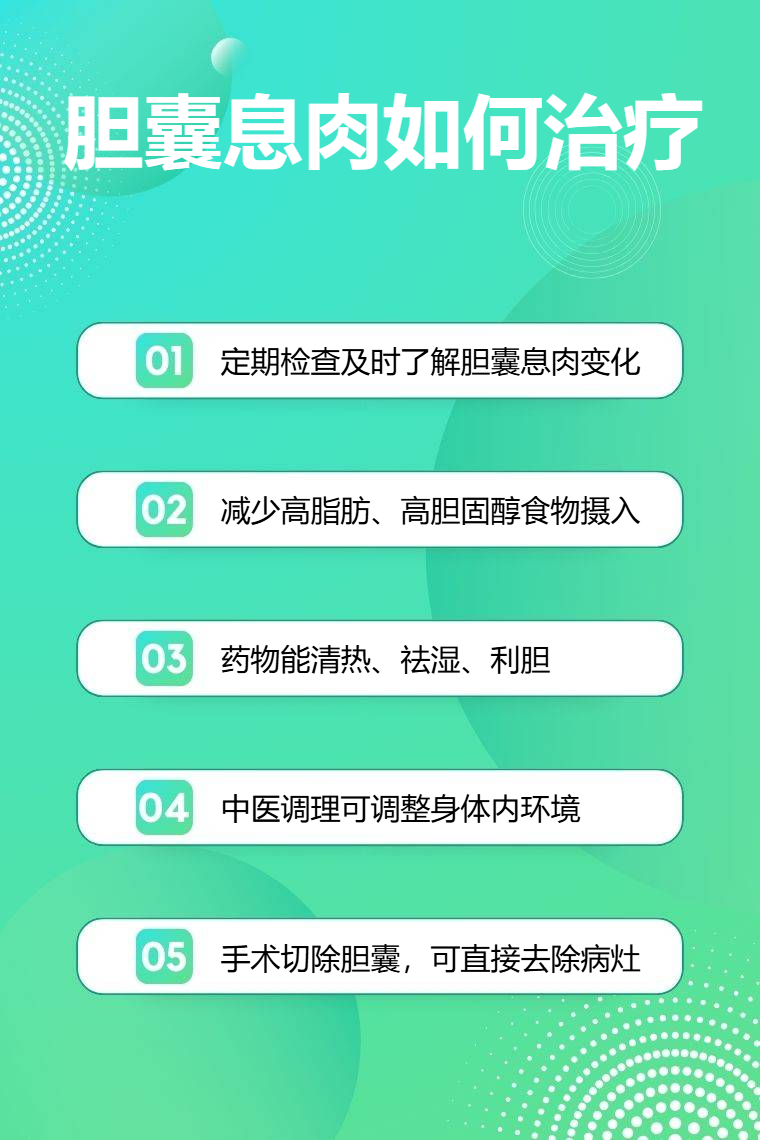 膽囊息肉的治療方法有定期復查、飲食調整、藥物治療、中醫調理、手術治療等。