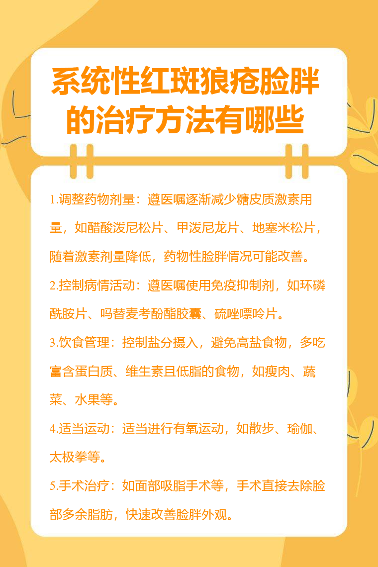 系統性紅斑狼瘡臉胖的治療方法有調整藥物劑量、控制病情活動、飲食管理、適當運動、手術治療等。