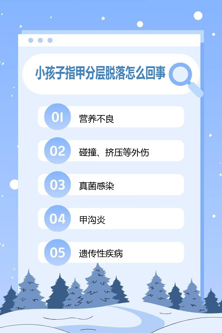 小孩子指甲分層脫落可能是由營養不良、外傷、真菌感染、甲溝炎、遺傳性疾病等引起。